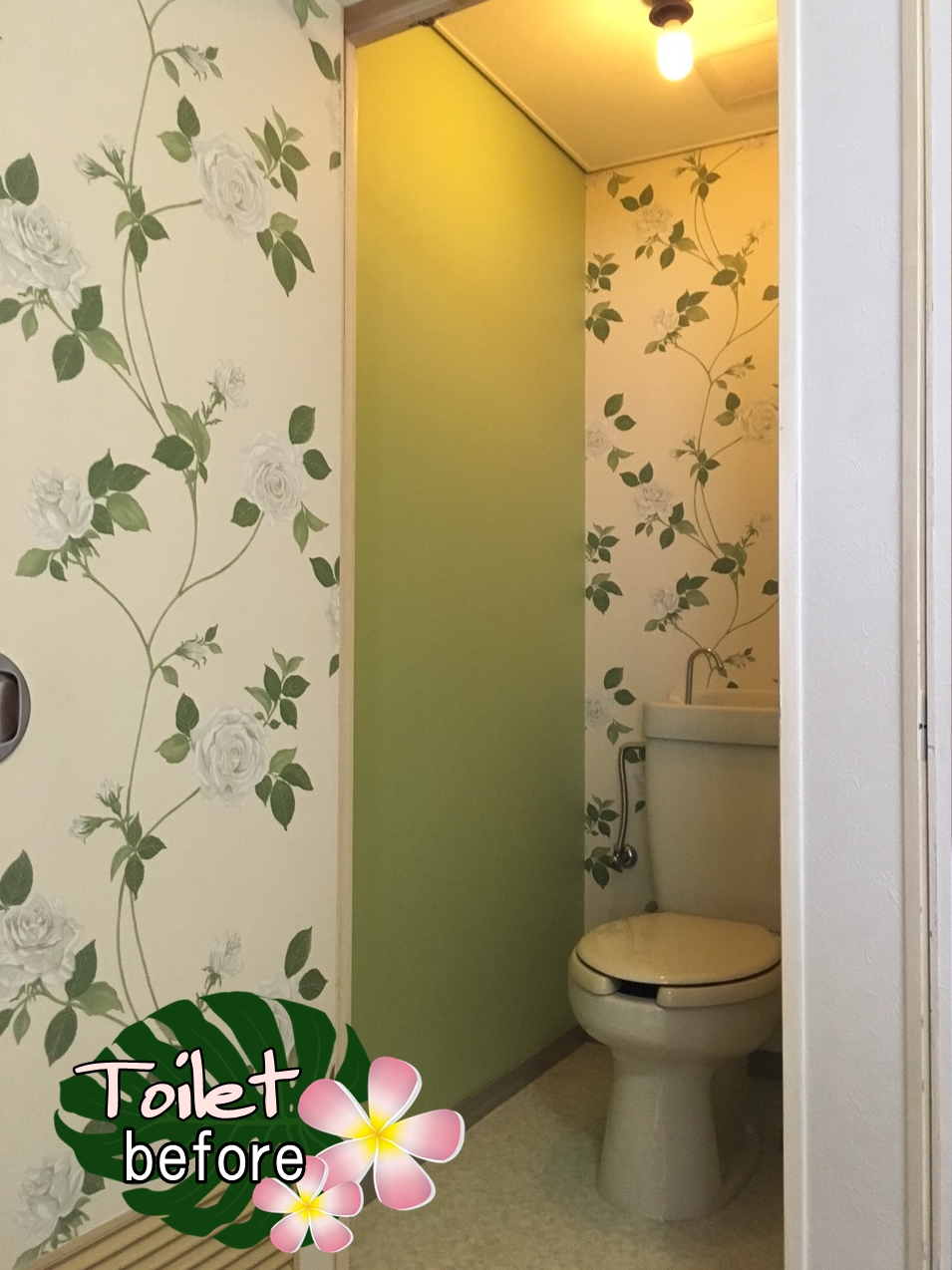 洗面室と同じフラワー柄の壁紙を使用してグリーンで統一されています。