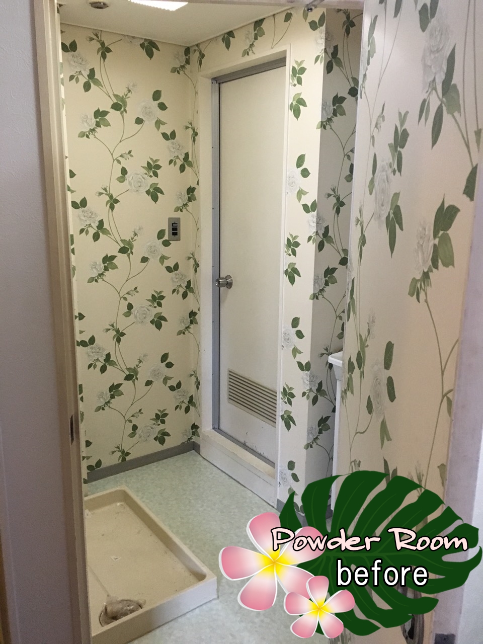 フラワー柄の壁紙が貼られた爽やかな洗面室ですが、和のテイストやアジアンのテイストを取り入れた店舗にすることを考えると壁紙の雰囲気が合っていないようです。また、もとは住居用の物件なので店舗には不要な洗濯機を置くための洗濯パンが据え付けられています。